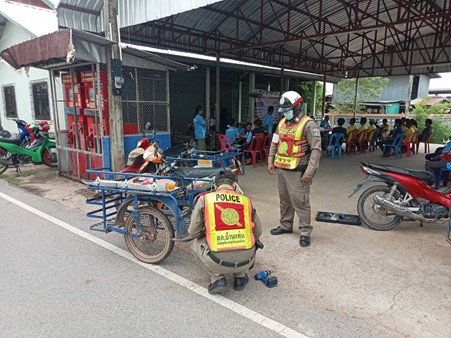 ร.ต.อ.สิทธิชัย เอนสันเทียะ รอง สว.(จร.) สภ.บ้านแท่น พร้อมด้วย จ.ส.ต.สิทธิพงษ์ พิมพ์จันทร์ ผบ.หมู่ (ป.) สภ.บ้านแท่น ร่วมกันติดสติกเกอร์สะท้อนแสงให้รถจักรยานยนต์พ่วงข้างเพื่อป้องกันและลดอุบัติเหตุ ที่บ้านวังหิน ต.บ้านเต่า อ.บ้านแท่น จว.ชัยภูมิ เมื่อวันที่ ๒๕ ตุลาคม ๒๕๖๗