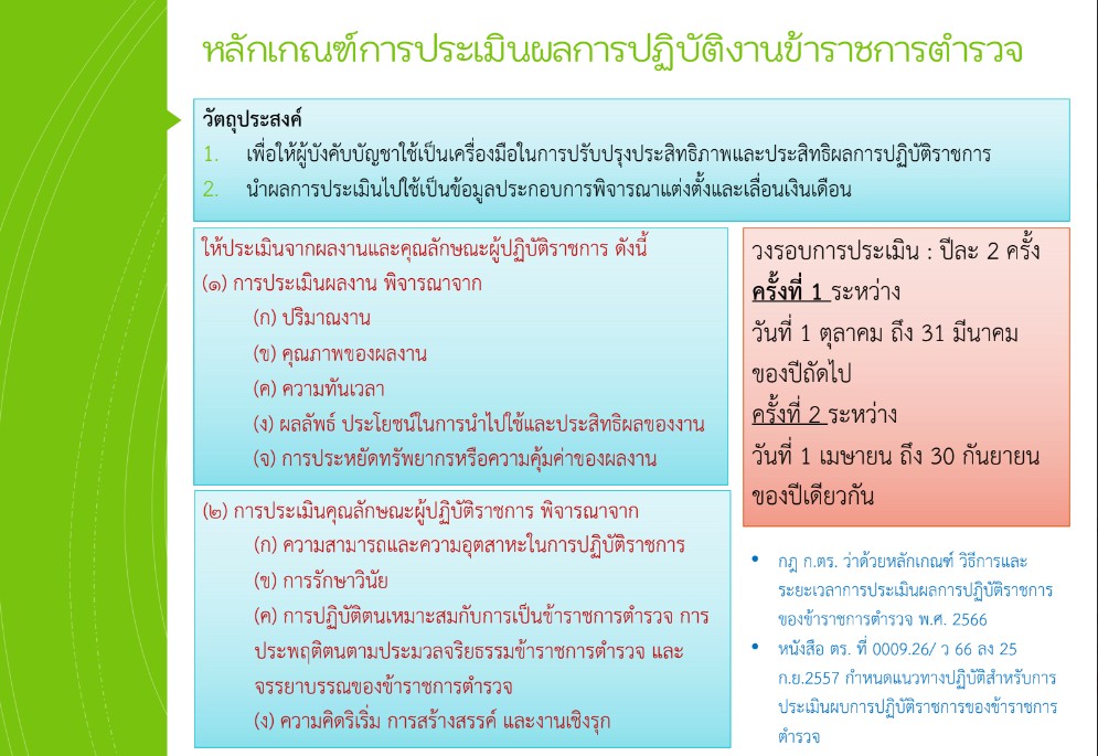 - กฎ ก.ตร.ว่าด้วยหลักเกณฑ์ วิธีการและระยะเวลาการประเมินผลการปฏิบัติราชการของข้าราชการตำรวจ พ.ศ.2566 (คลิก)